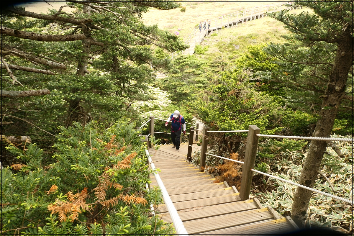 - 안내소에서 살채기도 - 4km, 고도상승 600m. 길은 괜찮은 편이며, 처음에만 바다 쪽 전망이 트여 있고, 나머지는 계속 숲길임. 경사가 다소 있기는 하지만 심한 편은 아님. 숲길로만 계속 이어지다 보니 답답하고 지루함. 실제로 평궤대피소까지 포함하면 5km 남짓이 전망이 전혀 없는 숲길임. 그래서 이 코스는 하산 코스로는 비추임. 3km 정도에 전망대를 만들어서 주변을 조망할 수 있게 하면 지루하다는 관념을 바꾸는데 크게 도움이 될 텐데 도무지 관리자들이 생각이 없음. 탐방객이 없으면 유인할 수 있게 버스 노선도 개설하고, 전망대도 만들고 하면 도움이 될 텐데.