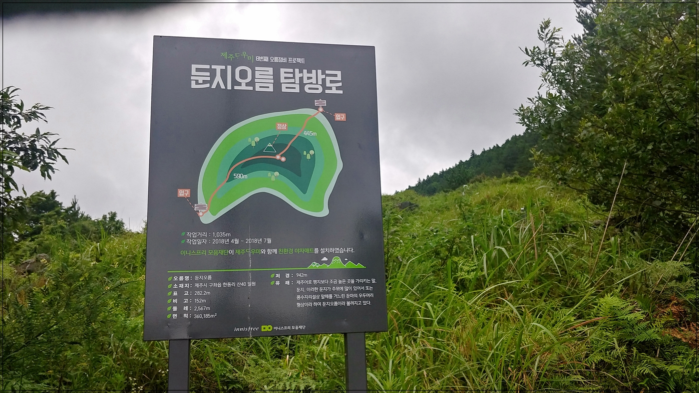 - 오름을 둘러가면서 농로?가 개설되어 있는데 이를 이용해서 가다 둘레길로 접어듦. 길은 매우 양호하나 정상으로 접근하는 길이 주변의 잡초나 잡목이 자라면서 길이 좁아져 있어 갈 때마다 다듬어 주어야 함. 굼부리 둘레길은 매우 좋음. 둔지봉에서 연결로도 대체로 괜찬은 편이나 일부 트랙터길이 하상이나 중하정도로 안 좋고, 메이즈랜드 정류장 바로 직전에 밭 하나를 가로 질러가는 것이 다소 걸리기는 하지만 반대편 입구도 트여 있어, 농작물에 유의하면 큰 문제는 없음.