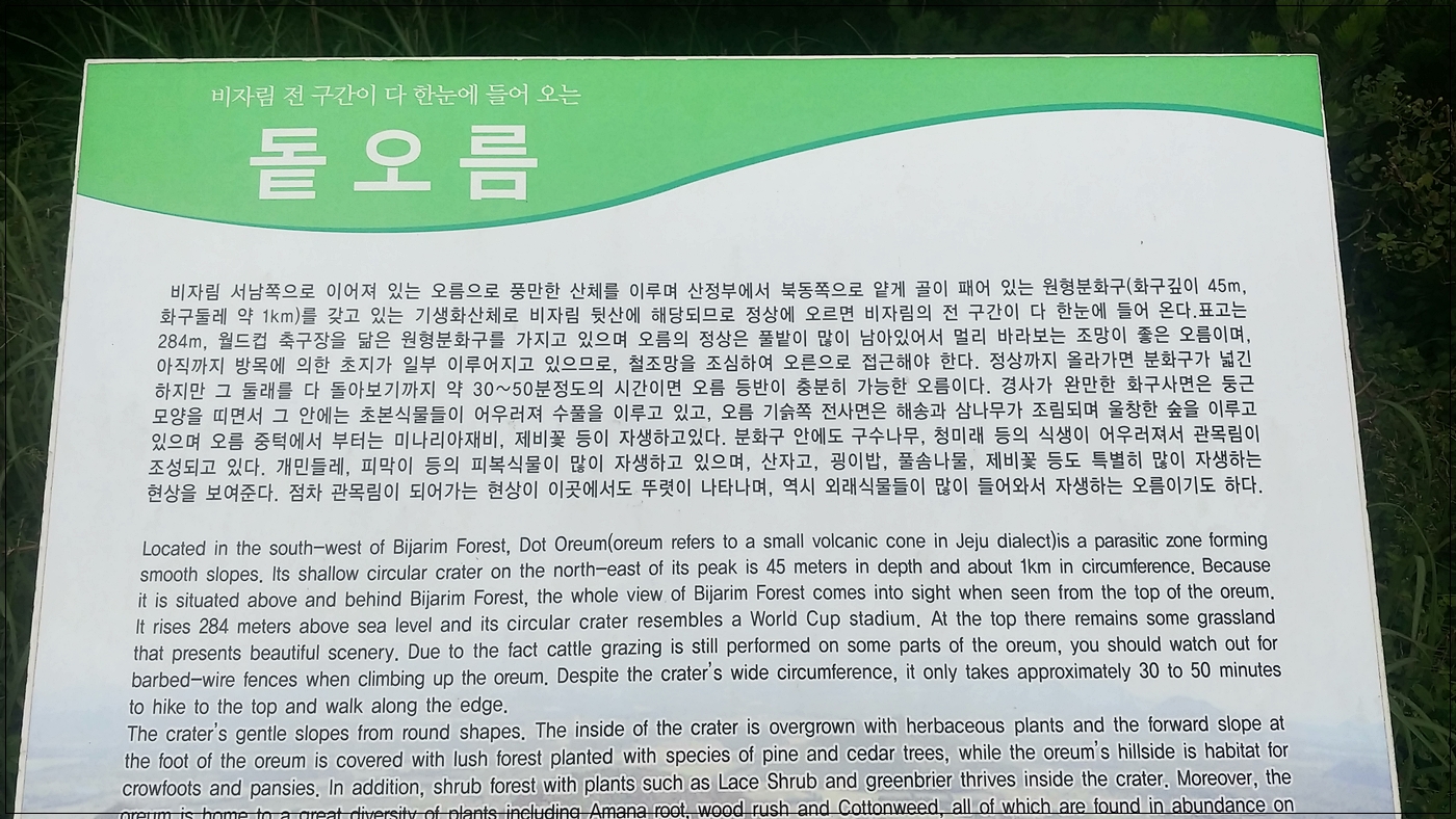 - 오름길은 따로 있지는 않으며 목장으로 편한 대로 올라가면 됨. 목장으로 이용되고 있어 철조망이 둘러져 있고, 소를 방목하고 있으며, 출입금지 팻말도 있으나 눈치를 보면서 슬쩍. 목초를 재배하고 있어 12월에서 4월 정도 탐방이 바람직함.