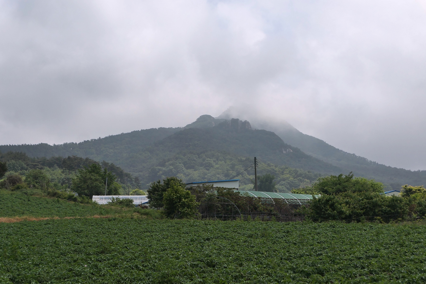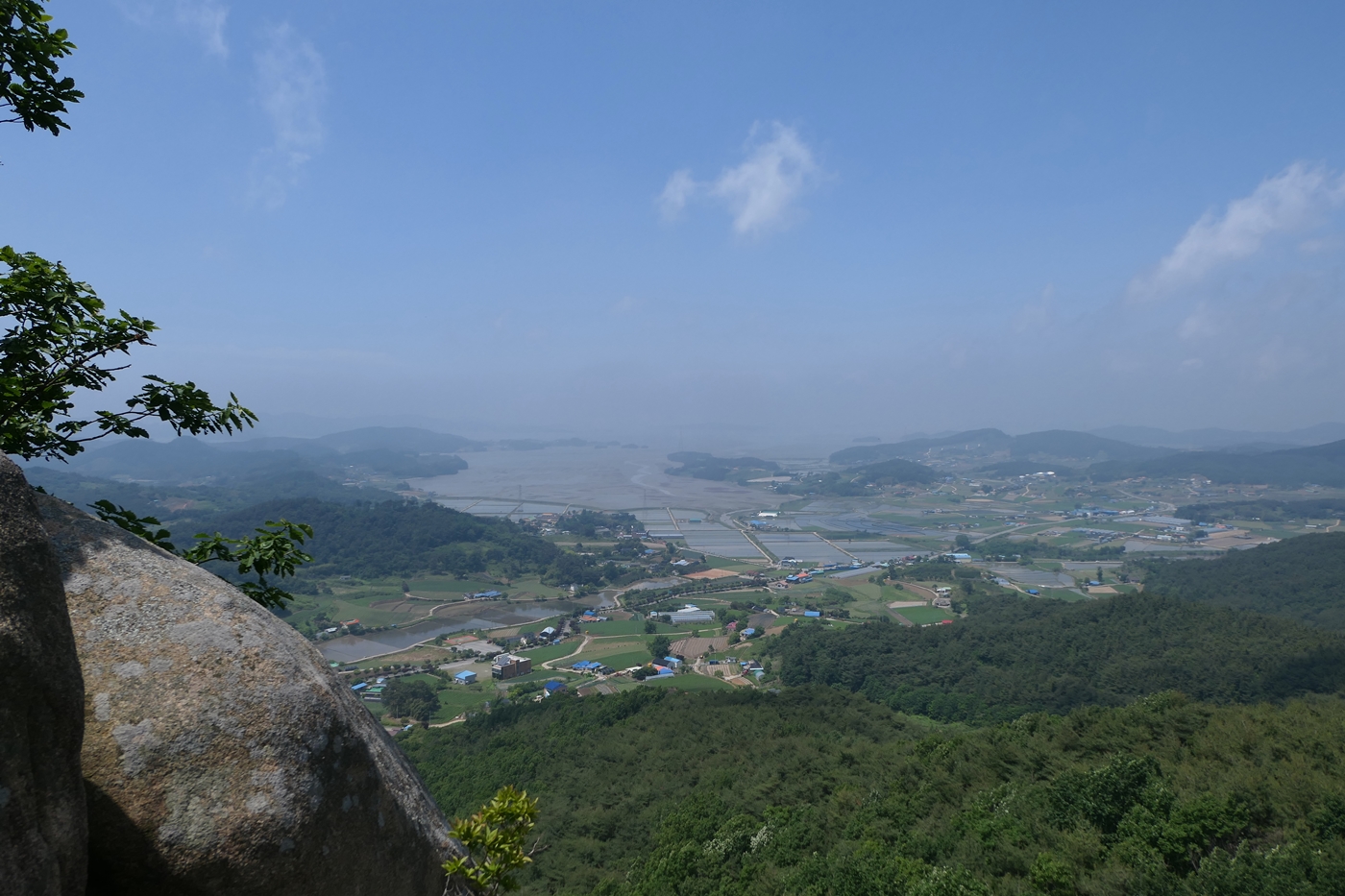 30분이면 도착할 것으로 예상했는데 해안가로 빙글빙글 돌아가는 버스로 호리로 가서 나온 후에 양길리로 가다 보니 거의 한 시간 가까이 걸린다. 차라리 잘 되었다. '비도 그치지 않는데, 서해안도 구경하고' 나름 위안을 삼는다. 아닌게 아니라 양길리에 하차할 즈음에는 비가 그치고 햇빛도 보인다. 세상에나 도저히 맞지 않을 것 처럼 보인던 일기 예보가 참 잘 맞는다. 저기 팔봉산처럼 보이는 산이 정상에 안개를 머금은 채 멋있게 반긴다. 지금까지의 걱정이 확 사라진다.