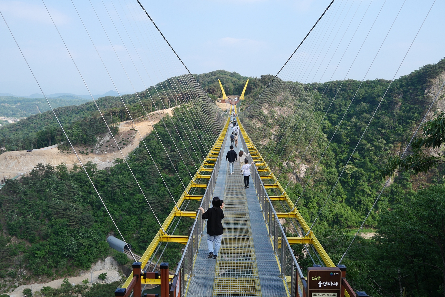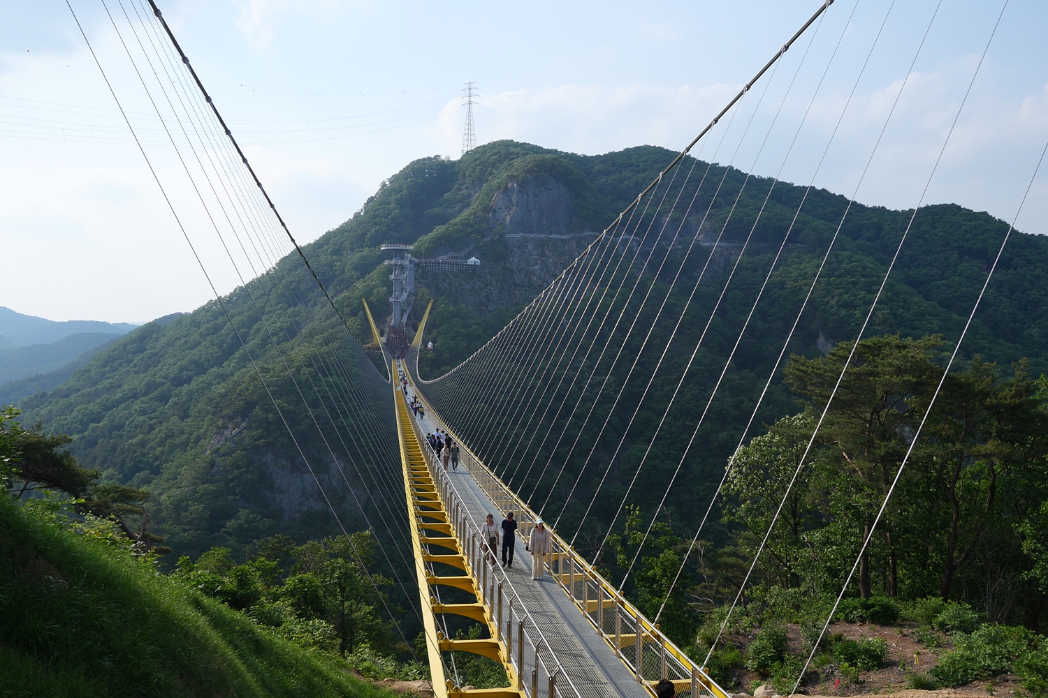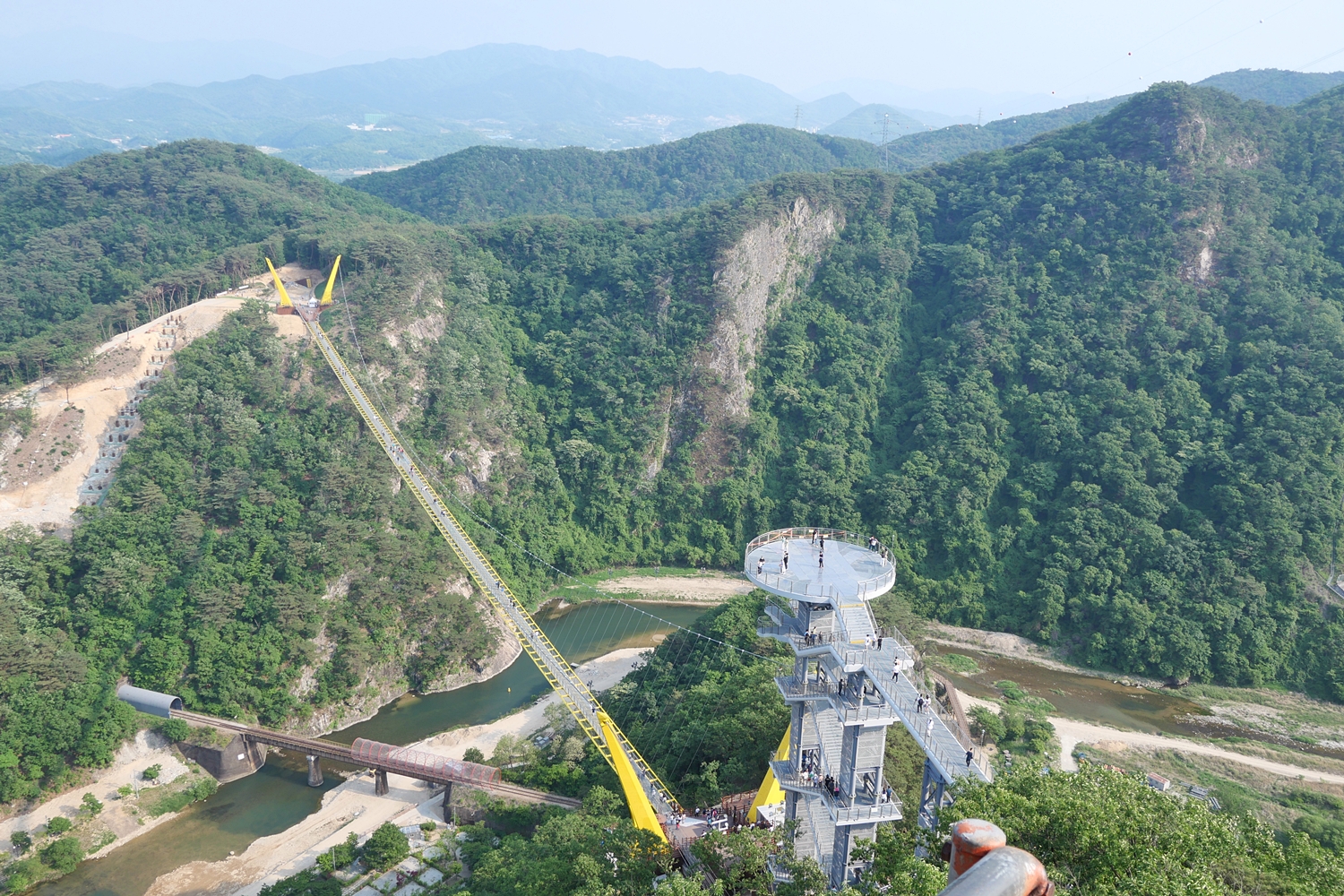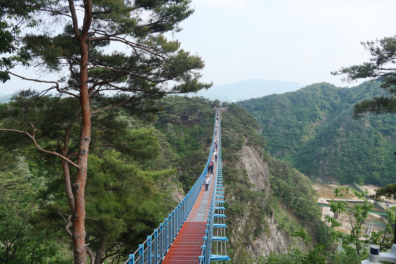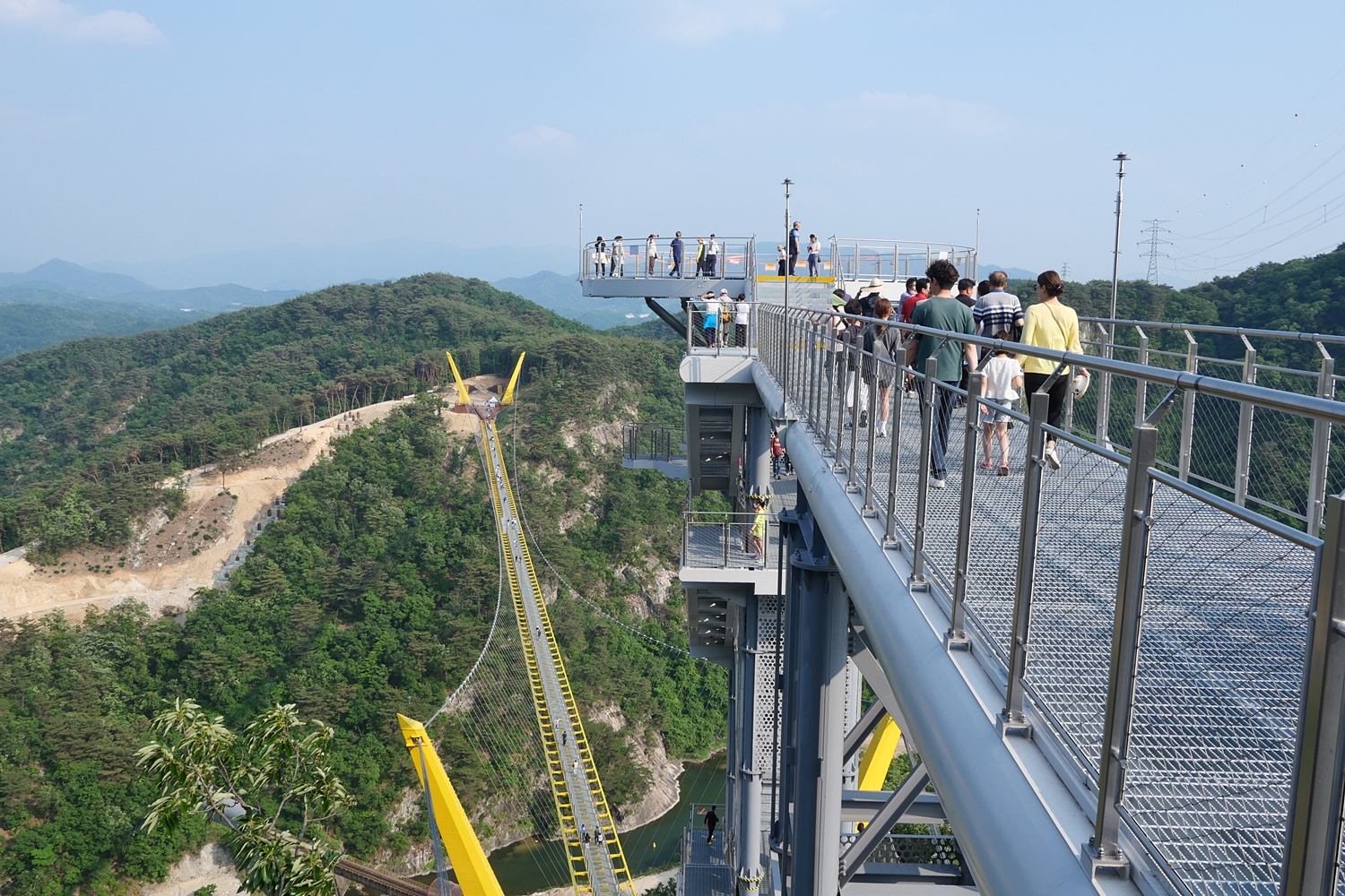 이 급경사를 내려가자 밑에서도 통제 표시 및 줄이 쳐져 있다. 보는 눈이 많아서 다소 황당하기도 해서 급히 빠져나오는데 여기가 엄청난 전망대이다. 여기서 보는 전망이 속된 말로 ‘대박’이다. 9천 원이 아깝지 않겠다는 생각이 든다. 전망대를 내려오면 다시 출렁다리가 있고 이 출렁다리에서 보는 전망도 좋았다. 중국 장가계에서 경험했던 (유리)출렁다리 못지 않은, 아니 그보다 더 낫다는 생각이 들 정도로 괜찮았다. 먼저 번 출렁다리에서 아줌마에게 인증샷을 부탁했는데, 사진 찍을 줄 모른다면서도 찍어준 사진이 꽤 맘에 든다. 이 다리에서는 젊은 친구에게 부탁했는데 별로이다. 이 다리를 건넌 후부터는 지그재그로 만든 흙길에 야자매트를 깐 숲길로 계곡까지 이어진다. 앞서 578계단보다 맘에 든다.
