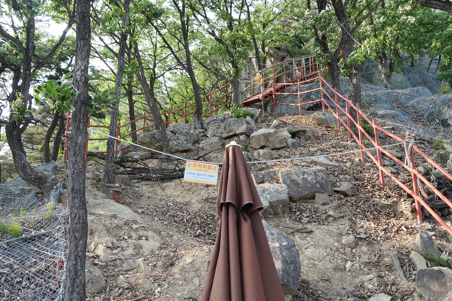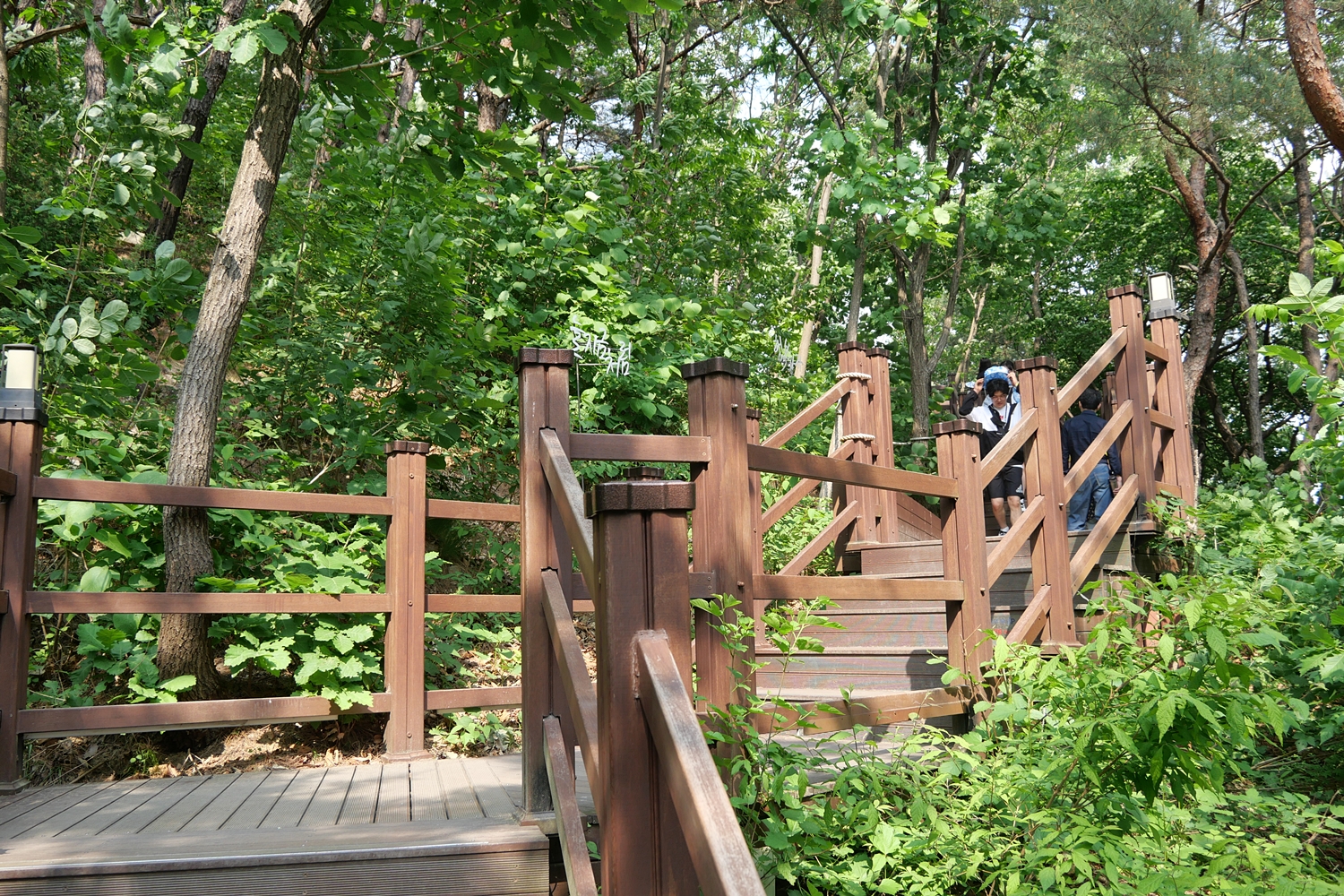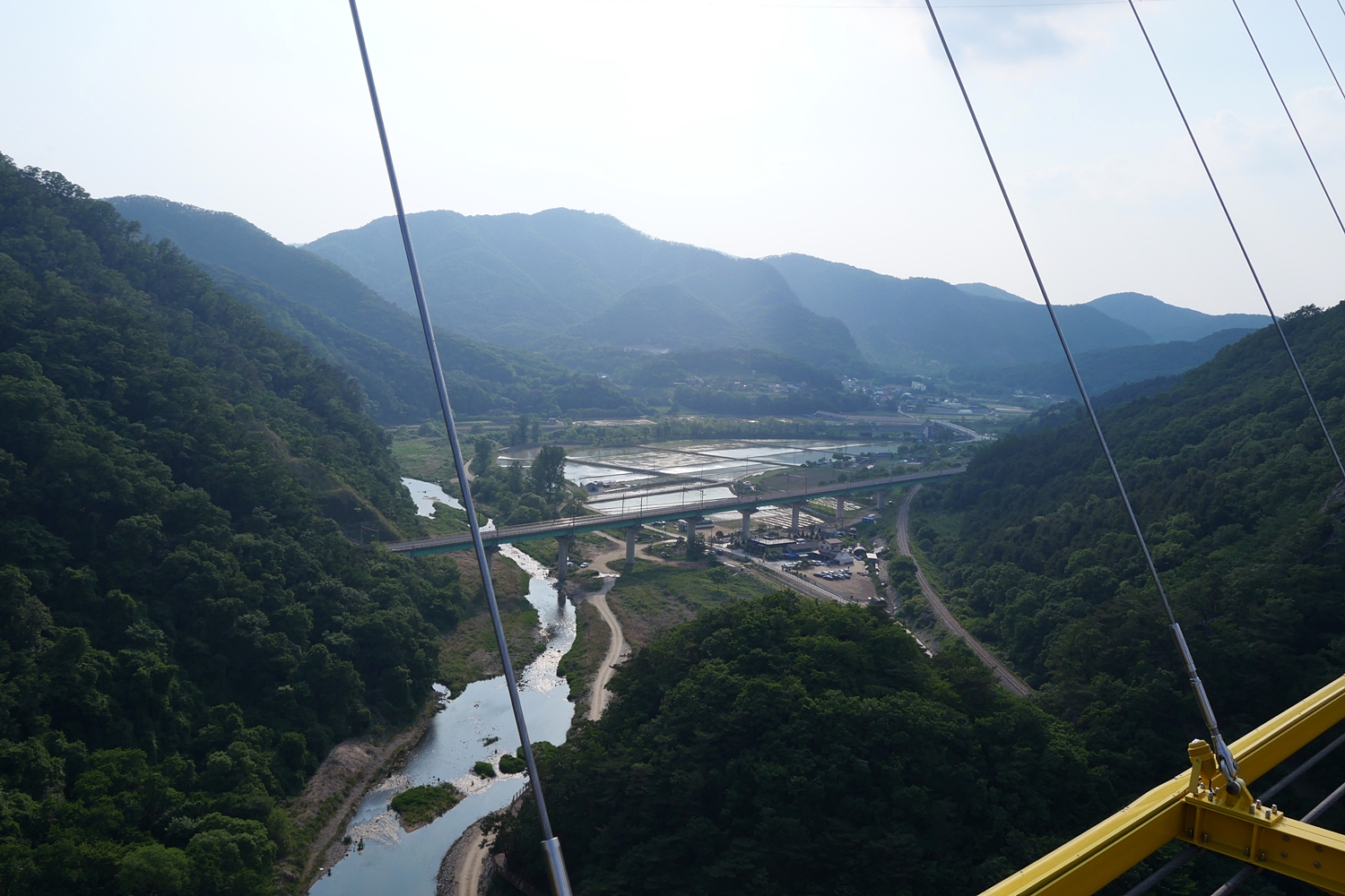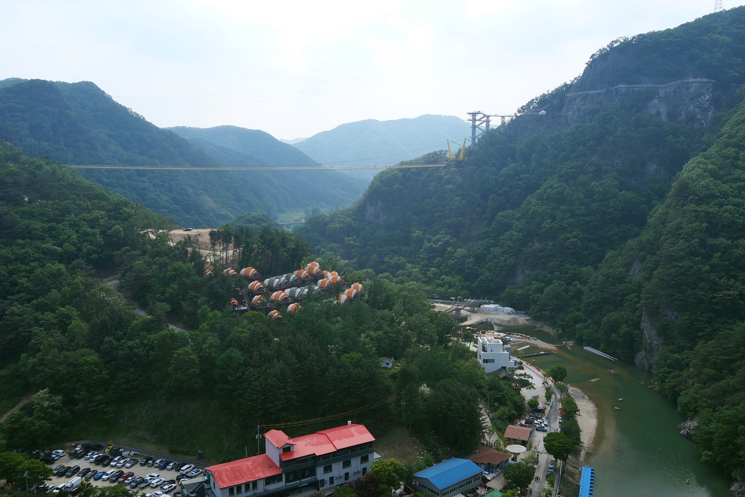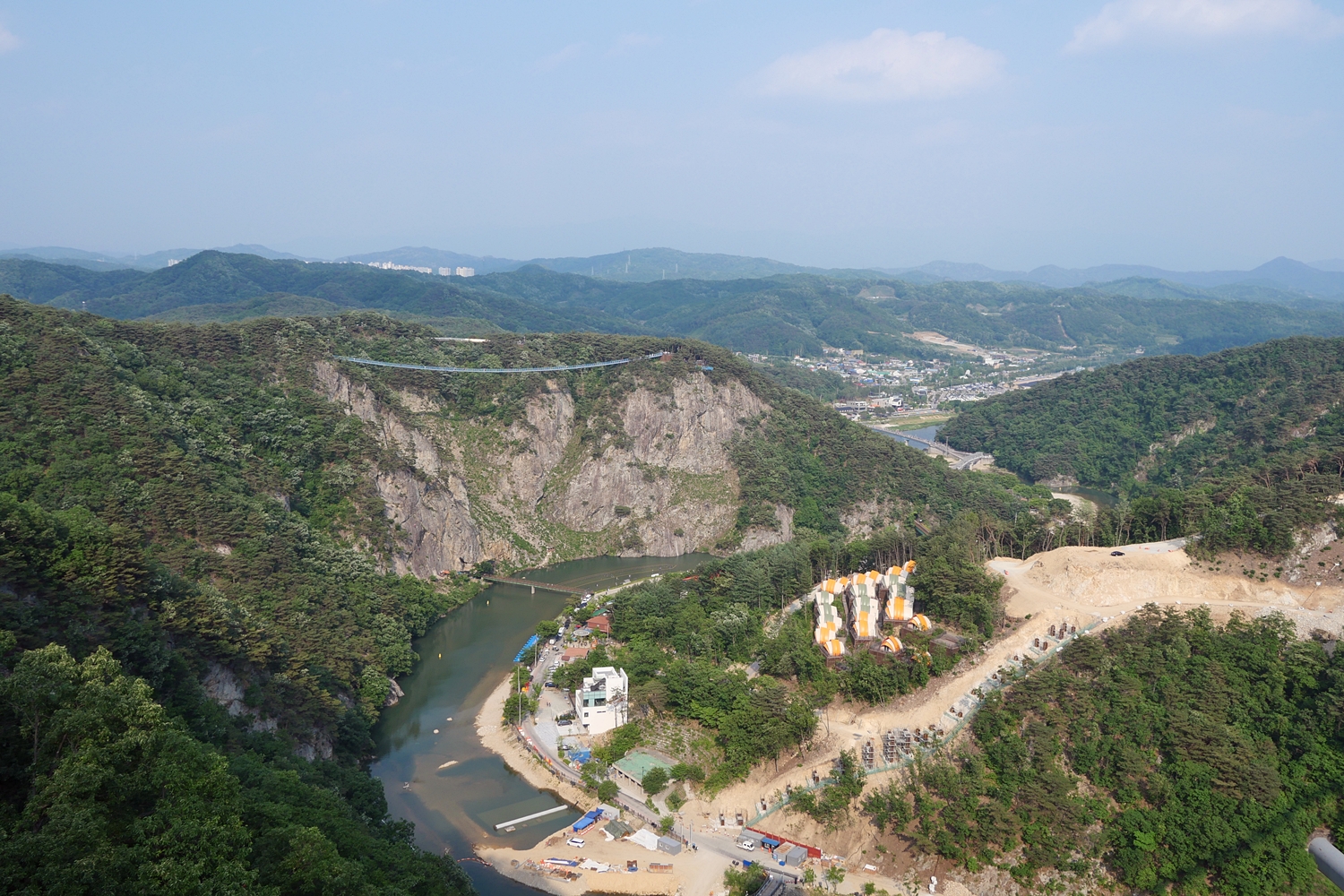 이 급경사를 내려가자 밑에서도 통제 표시 및 줄이 쳐져 있다. 보는 눈이 많아서 다소 황당하기도 해서 급히 빠져나오는데 여기가 엄청난 전망대이다. 여기서 보는 전망이 속된 말로 ‘대박’이다. 9천 원이 아깝지 않겠다는 생각이 든다. 전망대를 내려오면 다시 출렁다리가 있고 이 출렁다리에서 보는 전망도 좋았다. 중국 장가계에서 경험했던 (유리)출렁다리 못지 않은, 아니 그보다 더 낫다는 생각이 들 정도로 괜찮았다. 먼저 번 출렁다리에서 아줌마에게 인증샷을 부탁했는데, 사진 찍을 줄 모른다면서도 찍어준 사진이 꽤 맘에 든다. 이 다리에서는 젊은 친구에게 부탁했는데 별로이다. 이 다리를 건넌 후부터는 지그재그로 만든 흙길에 야자매트를 깐 숲길로 계곡까지 이어진다. 앞서 578계단보다 맘에 든다.