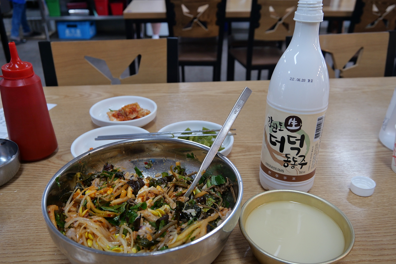 예정은 4시까지는 도착한다는 것이었는데 시티튜어버스를 만나서 1시간쯤 절약했다. 이제 시간을 절약하려고 굶었던 점심을 아무래도 먹어야겠다. 허기져서 기운도 다 빠졌다. 10여분 만에 산채비빔밥에 강원 생더덕동동주 한병을 해치우고(13,000원), 출렁다리로 향한다.