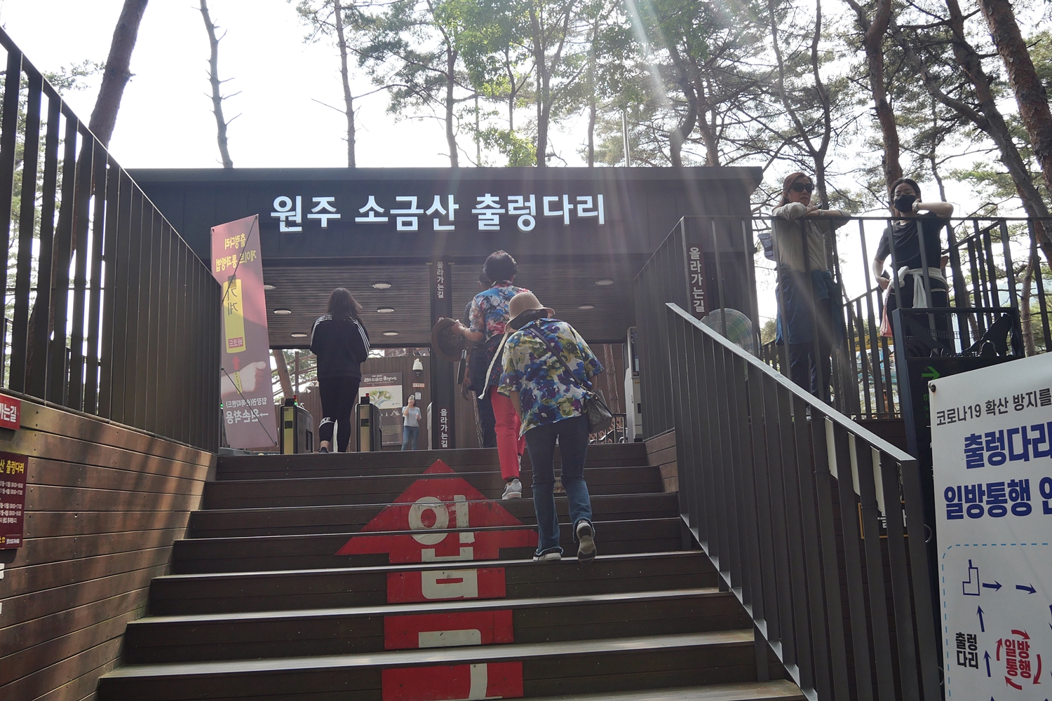 입장료가 무려 9000원. 다행히 유족증 덕으로 6천원에 입장한다. 출렁다리까지는 578계단을 올라야 하는데 계단 군데군데에 건강 수명이 표시되어 있다. 홍보용으로 꽤 괜찮다는 생각을 해본다. 지금 오후 3시 반인데도 사람들로 만원이다. 얼마나 대단하길래 하면서 출렁다리를 건넌다. 그저 그런 것 같은데. 다리를 건넌 후 살짝 길을 비켜 소금산으로 향한다. 경사가 다소 있지만 임도처럼 길이 훤한 흙길이다. 숲길, 특히 정상 능선의 소나무 숲길은 꽤 괜찮은데 대신에 전망은 거의 없다. 정상에 이르니 건너편으로 대도로?인데 등산로 폐쇄 표시가 있다. 무시하고 그냥 트랙을 따라 가보는데 능선 끝에 이르니 폐쇄 이유가 이렇다. ‘유료구간이니 표를 끊고 이용하시오.’ 표를 끊었으니 당당하게 금줄을 넘어 수직 계단을 내려간다. 무서워서 그냥 계단 손잡이만 보면서 뒷걸음으로 내려간다.