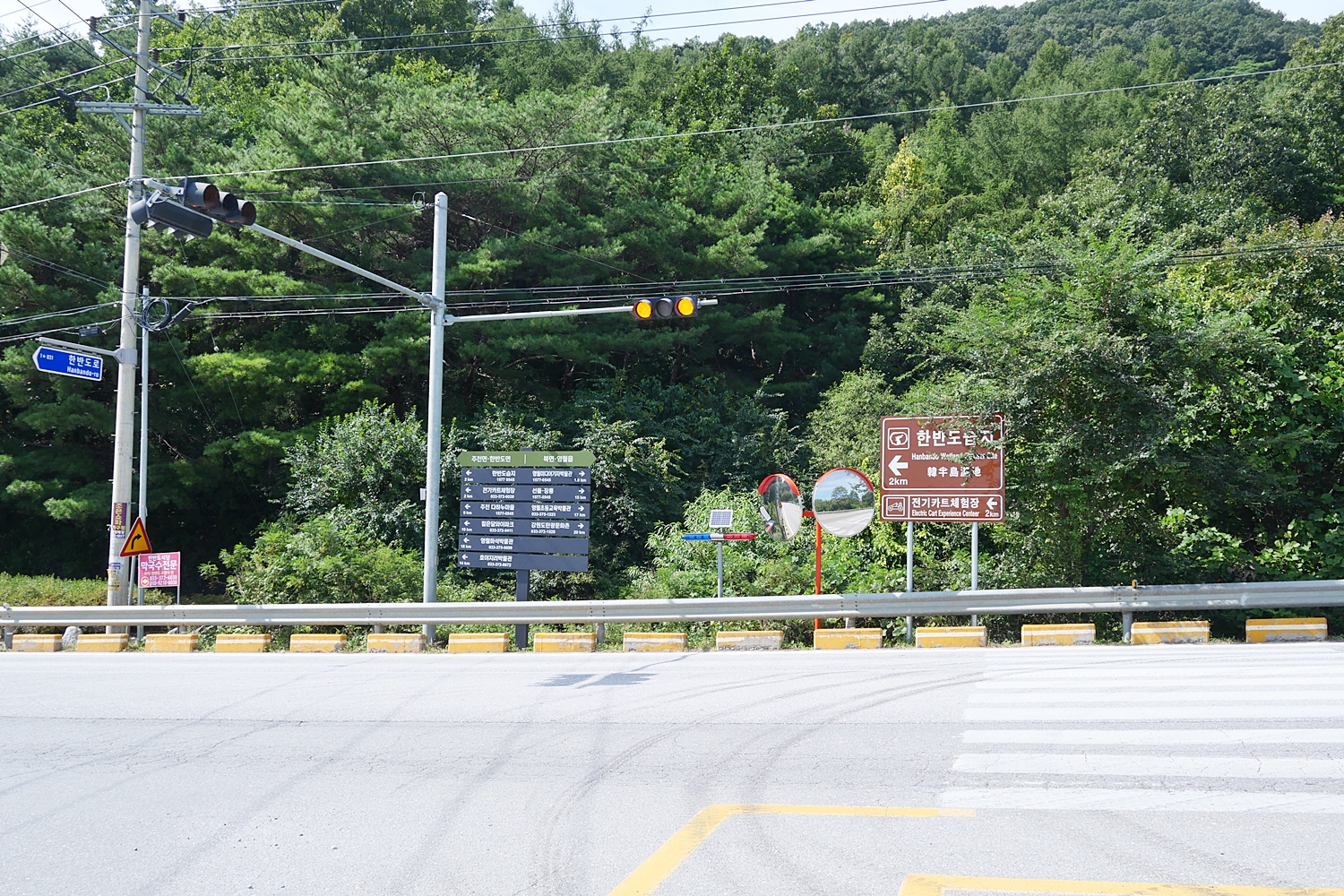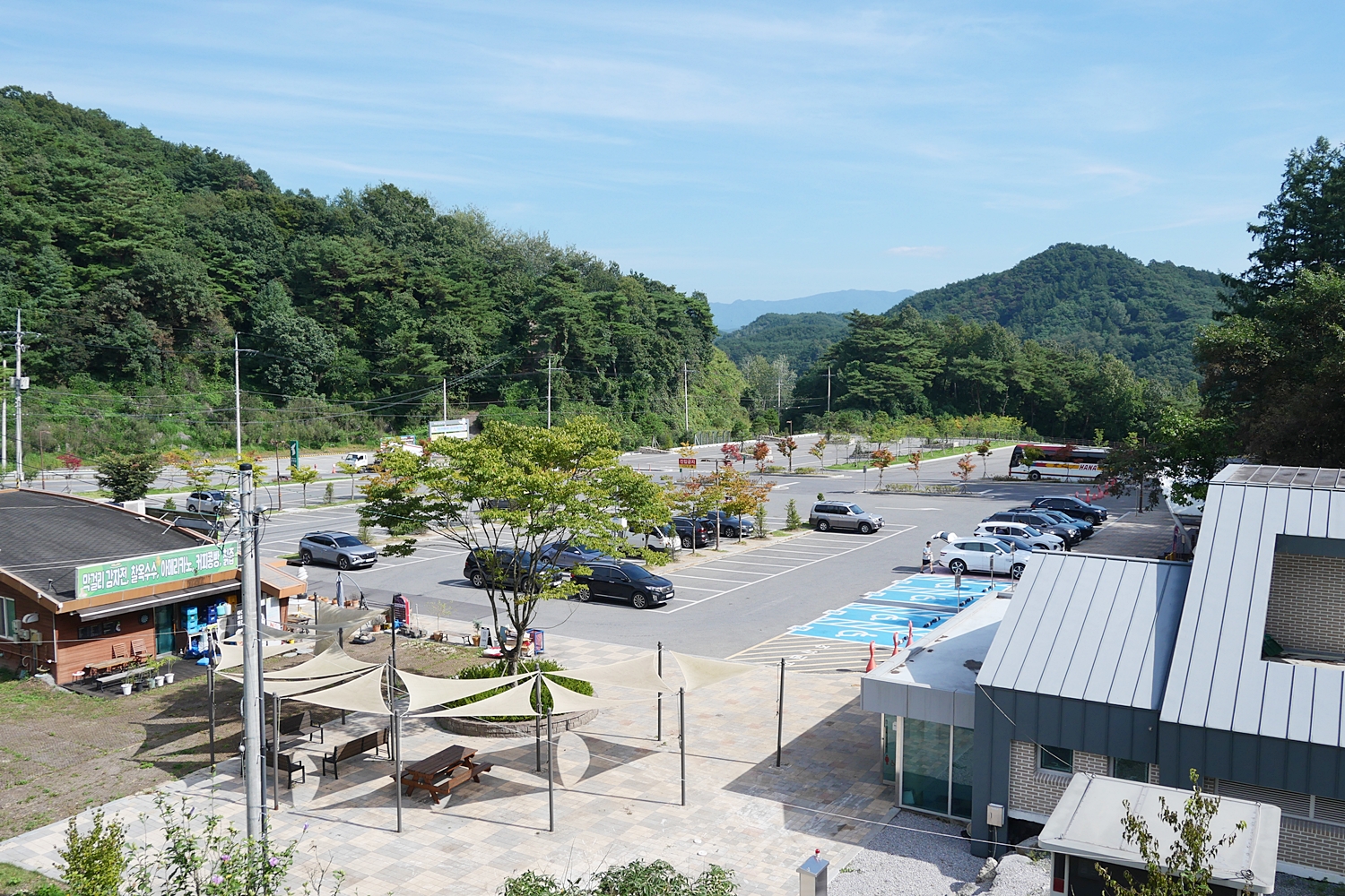방법이 없다. 일단 한반도지형 입구 정류장에서 내려 한 2.5km를 걸어가기로 한다. 육지 산행을 다니면서 대부분 교통편이 불편한데, 5~6km 정도는 걸어서 간다고 생각하면 훨씬 선택의 폭이 넓어질 수 있다. 가을 날씨답지 않은 더위에 햇살도 따가운 포장로를 30분쯤 걸어 한반도 지형 주차장에 도착했다. 버스 편을 물어보니 돌아가는 버스도 이미 끝났다고 한다. 버스를 놓치지 않았어도 결국은 다시 걸어서 입구까지 갈 수밖에 없었다. 입구에서는 그래도 1시간에 한 대 정도는 있다.