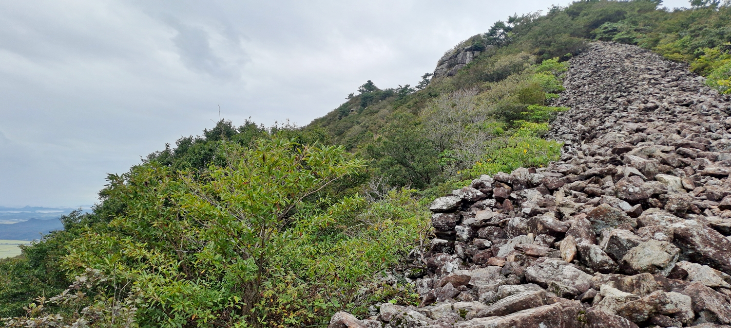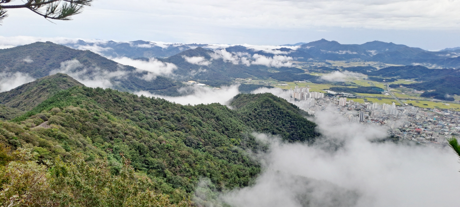 우정봉 지나면 완경사 또는 평지 같은 등산로로 대부분 흙길이다. 저기가 정상인가 하는데 너덜길이 정상 가까이까지 쭉 펼쳐져 있다. 신기하다. 후에 보니 금강산성의 흔적. 사방이 열리는데 환상적이다. 해남 시가지와 그를 둘러싼 산들, 여기에 수놓는 하얀 안개가 너무 멋져서 계속 폰카를 눌러댄다. 정상에는 데크전망대를 설치, 사방을 둘러볼 수 있게 해놓았다.