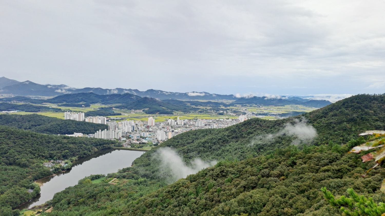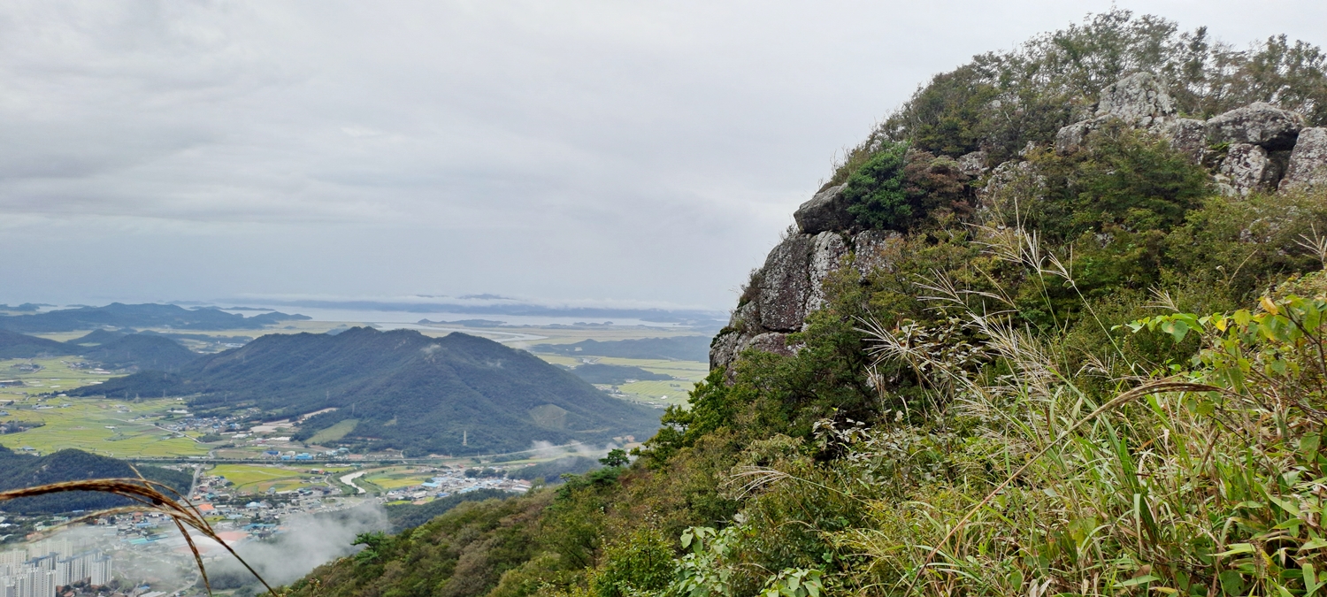 등산로는 잘 정비되어 있다. 처음에는 급경사의 돌길로 안전기둥에 밧줄을 연결해 놓았지만, 위험, 공포구간은 없다, 중간중간에 보이는 바위는 금강산의 바위가 여기까지 굴러오면서 닿았는지 별로 볼품은 없다, 급경사를 다 오르면 우정봉이다. 우정봉 근처에서 전망이 열린다. 안개와 어우러진 해남 시가지와 주변 산들이 멋있다. 비날씨에 기대하지 않았던 만큼 꽤 감동적이다. 불편하지만 삼각대를 꺼낸다. 카메라 대신에 핸드폰으로 인증사진을 담는다. 다행히도 비는 더 내리지 않는다.
