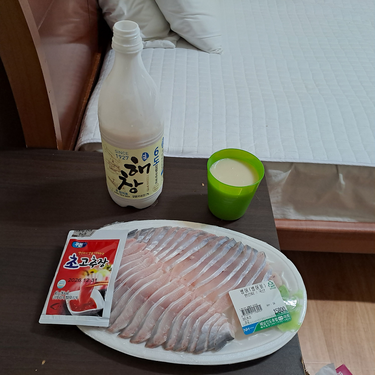 오늘 저녁은 병어회에 해창막걸리, 컵라면에다 김밥이다. 해남의 막걸리는 6도 8도 12도 등 도수가 다양하고, 12도는 마트에서 무려 8,500원이다. 영어표기도 rice wine이 아니라 rice beer다.