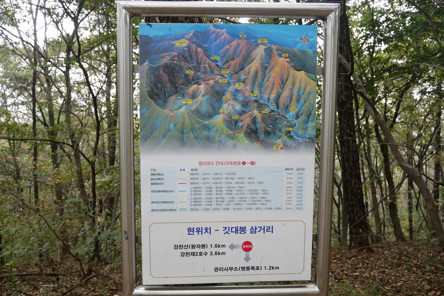 ☞ 특징 : 등산로는 뚜렷. 능선까지 오르는 길이 주로 흙길에 잔돌이 섞인 경우가 많고 고도로 300 정도가 깔딱고개로 꽤 힘들다. 능선길은 비교적 좋으며, 깃대봉 오름길 외에는 평지거나 완경사. 형제봉에서 제2강천호까지 내림길 역시 경사가 좀 있고 길이 안 좋은 곳도 있으나 미리 걱정할 정도는 아님. 사방댐까지 호반길?은 오히려 안 좋음. 길이 좁고, 비틀어지고, 오르내림도 좀 있음. 사방댐 이후는 고속도로임.
