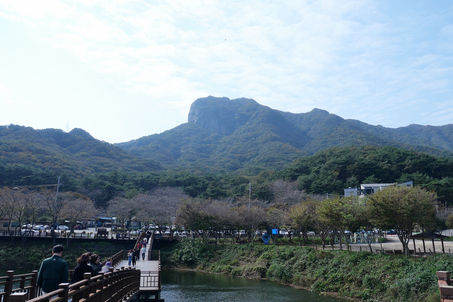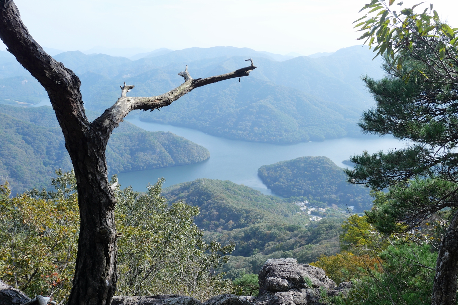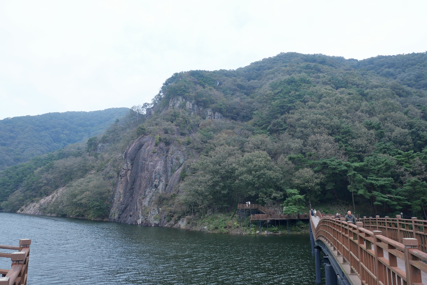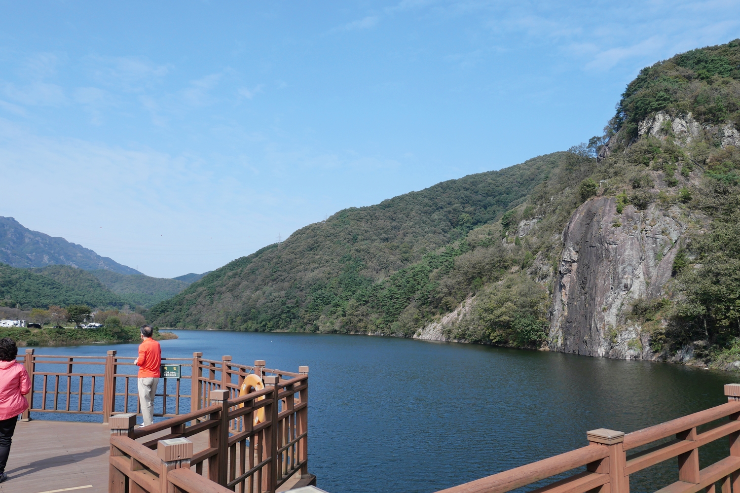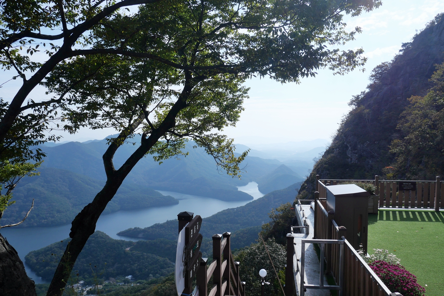 여전히 시간이 넉넉해서 담양호반을 거니는 용마루길로 향한다. 다리를 건너 뒤돌아보니 멋진 바위봉우리가 거대하게 내려다본다. 저게 뭔가 하면서 자세히 보았더니 정상 바로 밑에 암자가 보인다. 보리암이 저렇게 멋진 산이었나. 나무만 보고 숲을 보지 못한 보리암 산행이었다는 것을 비로소 느낀다. 인증사진을 담으려 하는데 사람들이 자주 오가고 장소가 좁아 데크 기둥 위에 카메라를 올려놓고 담아 본다. 마음에 썩 들지는 않지만 그래도 봐 줄만은 하다.