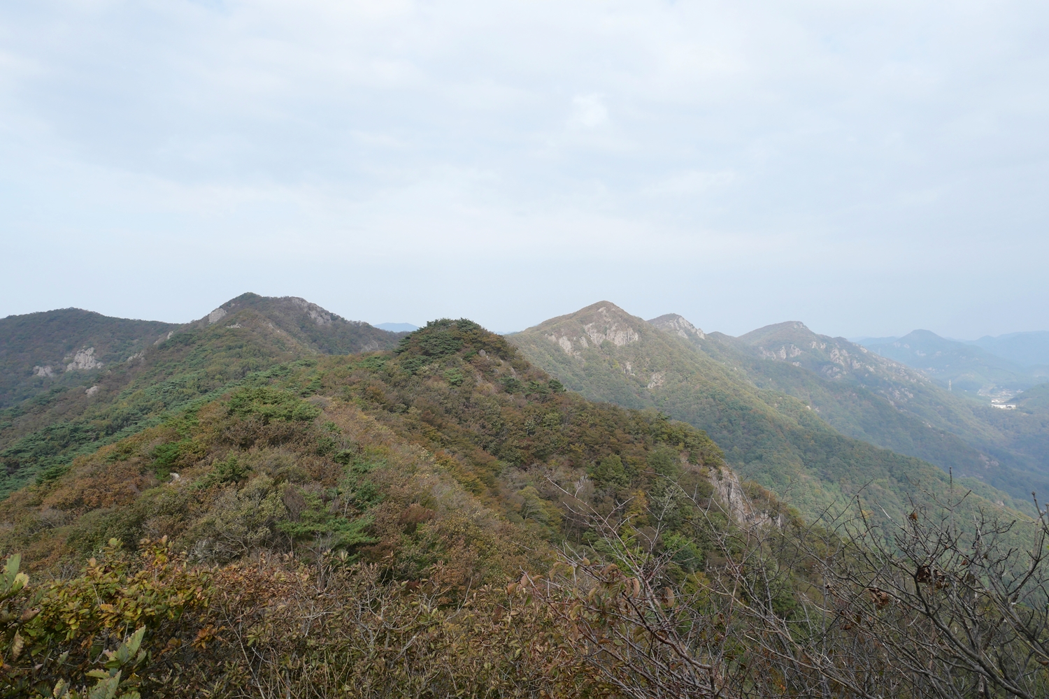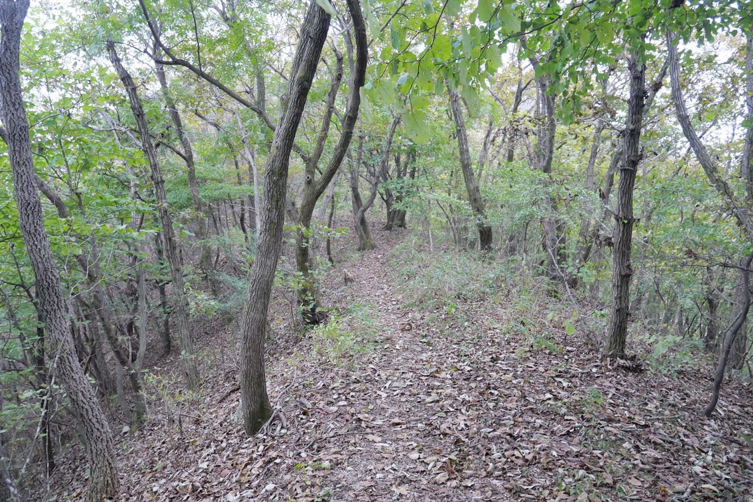 능선에 오르니 거의 평지 또는 완경사에다 기분 좋은 흙길이 추월산 기슭까지 이어진다. 당연히 주변 조망은 거의 없다. 땀을 뻘뻘 흘리다가 능선에 오르니 처음에는 시원, 나중에는 오히려 춥다고 느낄 정도, 이제 겨울이 오는 건가 생각도 해 본다.