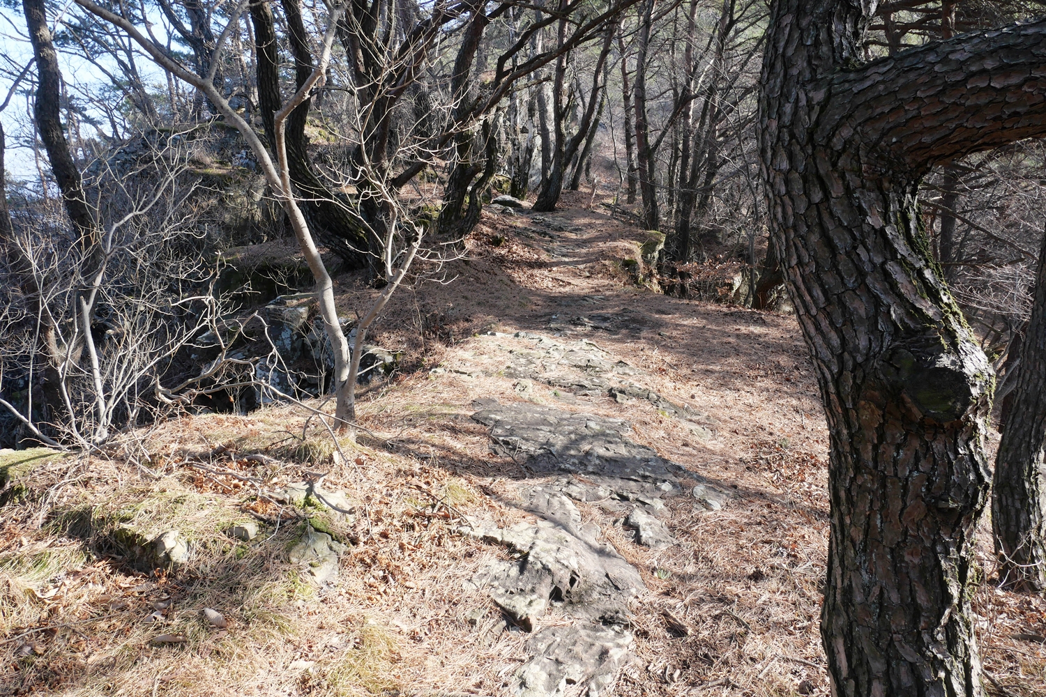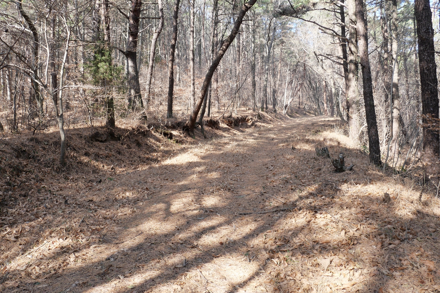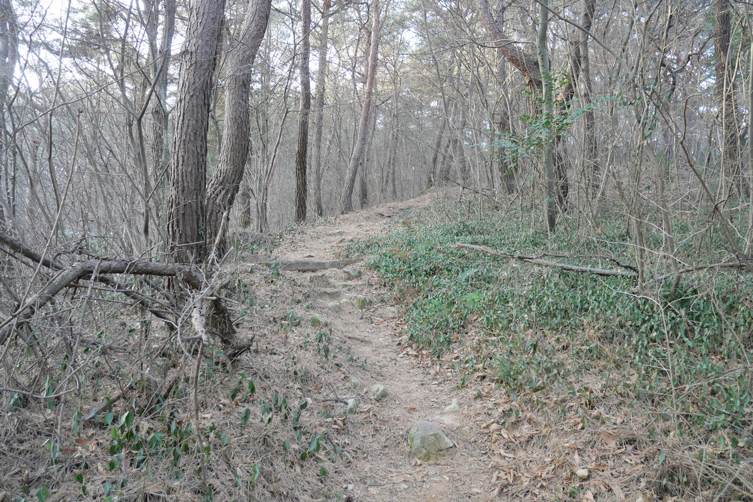 능선까지 오르는 처음 등산길은 다소 오르막이기는 하지만 그리 힘들 정도는 아니고 길도 괜찮다. 능선에 오른 후부터 정상 직전의 봉우리인 국수봉까지는 완경사에 부드러운 흙길, 오르내림도 별로 없다. 3시간 코스였다는 게 이런 길 때문이구나 하고 생각해본다. 8Km의 배낭을 지고도 부담이 별로 없다. 두세 군데 전망 바위가 있기는 하지만 대부분 전망이 없는 숲길이다.