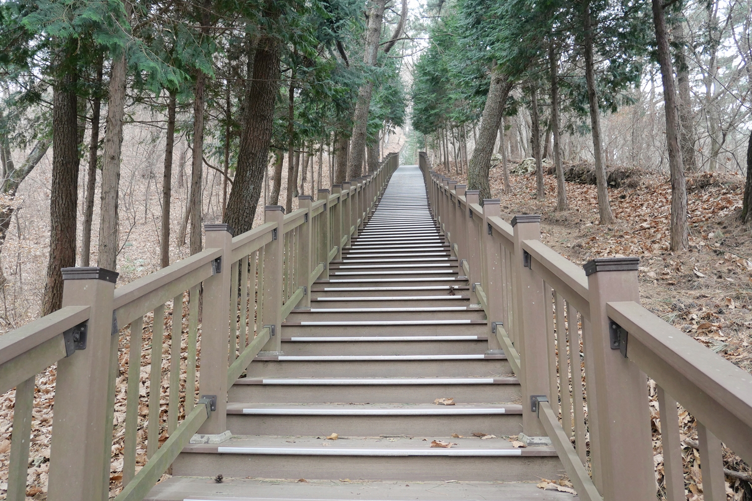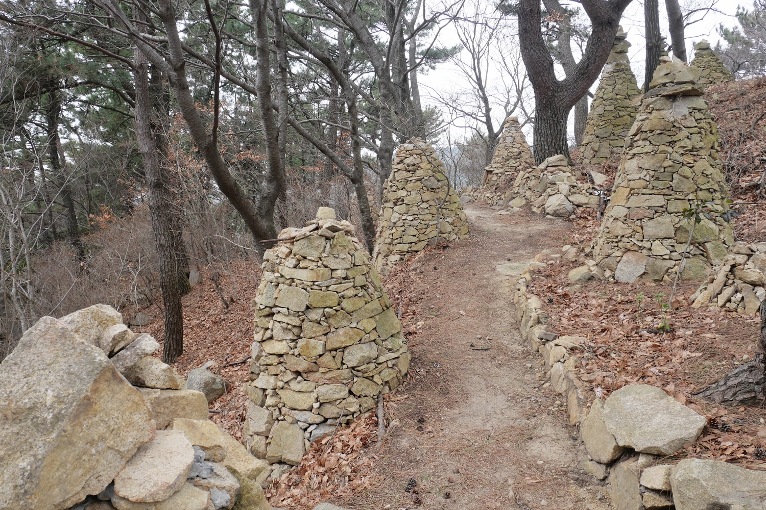 제2망루에서 산성 밖으로 나선다. 여기서부터 백양산 이정목을 지나, 불웅령 0.9km 이정목 전까지는 길이 너무 좋다. 부드러운 흙길이 너무나 기분이 좋다. 쇠미산의 끔찍해 보이는 계단길도 있지만, 그 외에는 걱정할 정도의 오르내림도 없다, 소요시간을 6시간까지 고려했는데 이런 길이면 5시간이면 가능할 것 같다는 생각을 하면서 열심히 걷는다. 이 구간은 쇠미산 전망대 외에는 거의 전망이 없다. 숲사이로 돌산인지 금정산?인지 언뜻언뜻 보이기는 한다. 백양산이 시작되는 지점에는 기분 좋은 편백숲길이 꽤 길게 이어진다. 게다가 이 구간은 부산시에서 운영하는 갈맷길과 연결되어 잘 정비되어 있고, 군데군데 화장실도 있다. 그래서 그런지 평일인데도 사람들을 꽤 만나는데 역시 노인들이 주.
